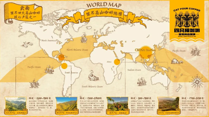 最后是云南文化与产品的结合,四只猫咖啡推出的产品高山黑咖啡,是因为这款咖啡产自云南海拔800~1800米的咖啡产区。这不仅将云南文化的烙印打在了产品上,并且也用“海拔高度是影响咖啡质量的重要指标之一”的全球行业共识为自己的产品标榜。