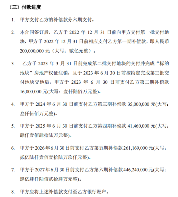 - 该公司披露,截至2022年12月16日,上手厂根据收购土地使用权补偿合同向虹口土发中心交付第一批交付地块,收到虹口土发中心支付的第一期补偿款人民币2亿元。