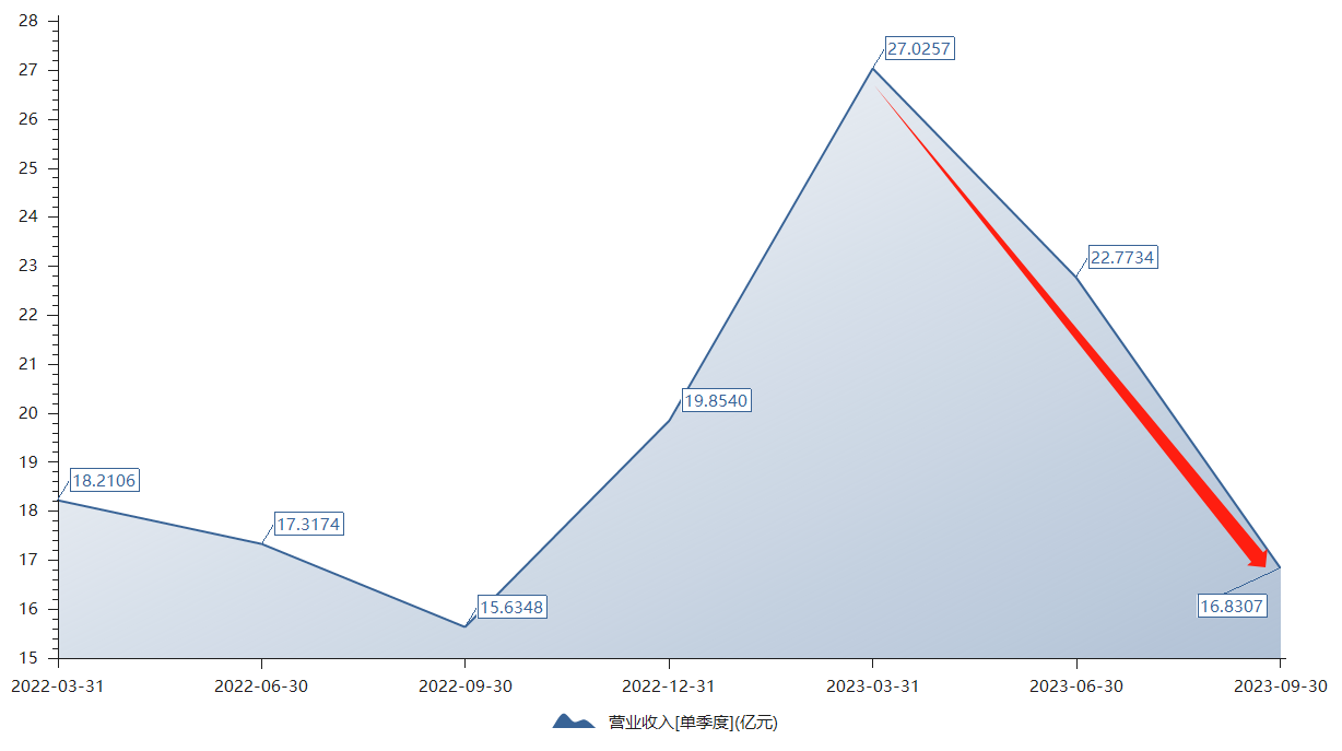 鱼跃医疗2023年业绩回暖是否是昙花一现?从实际数据来看,2023年以来单季度营收呈现环比下滑态势。2023年一季度营收达27亿元,3月—6月营收下滑至22.77亿元,6月—9月下滑至16.83亿元。营收下滑速度加剧,第二季度营收环比下滑15.76%,第三季度这一下滑幅度增至26%。