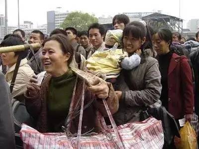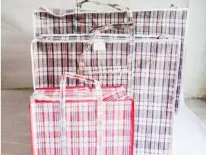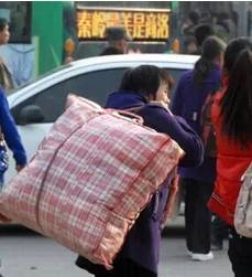 而在火车站盛行的红白蓝编织袋,