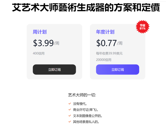 目前,Artguru.ai采用的是订阅制的商业模式,用户可按周,或按年进行付费,开通付费后,用户可以体验更快的生成速度,并且每一张生成的图片都能得到私有的商业版权。