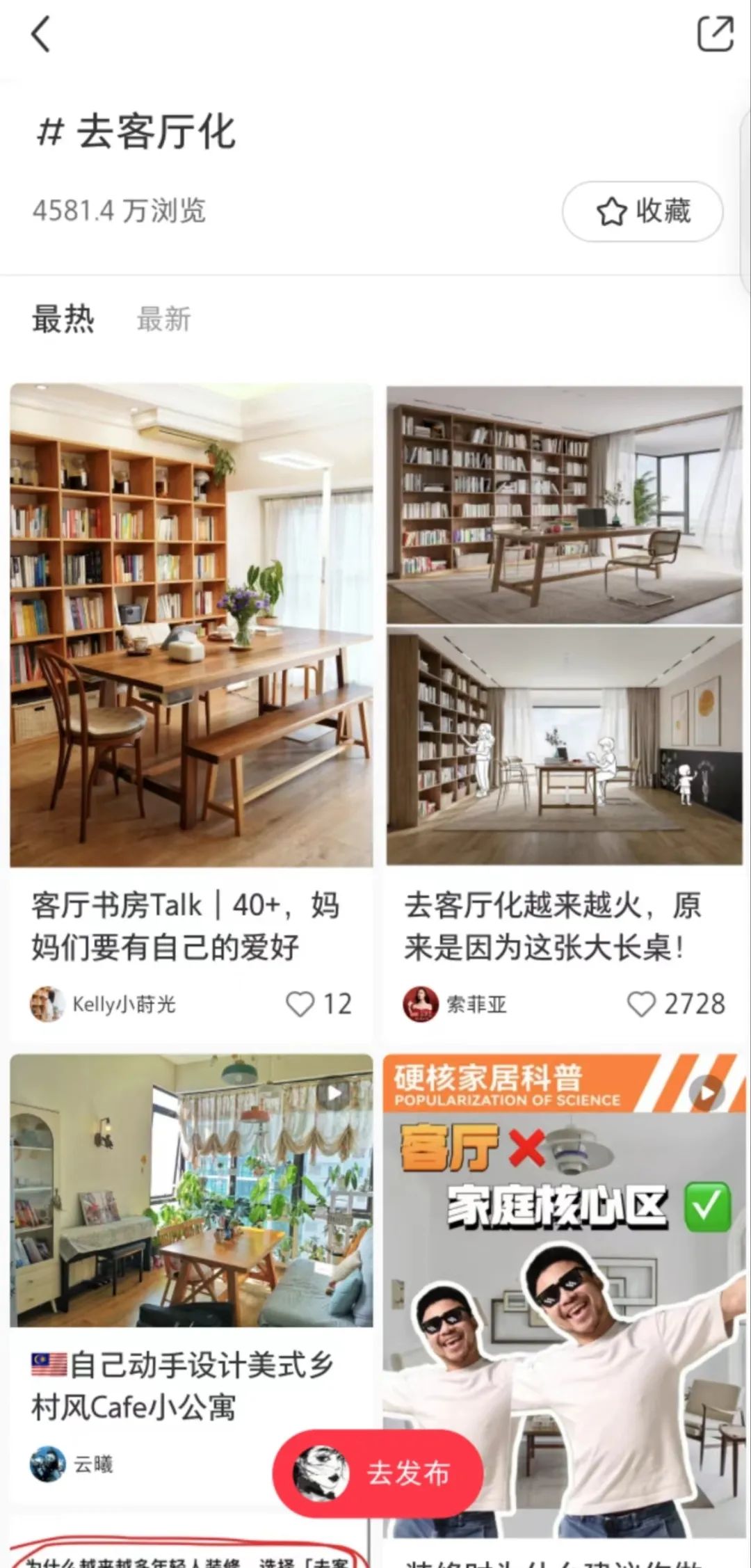 小红书上#去客厅化的话题拥有四千多万浏览度。在这个话题下,大家纷纷表示去掉传统的客厅布置后,「省钱」、「空间大多了」;在改造完毕的帖子下,评论区里不乏询问每一款家具的尺寸、跃跃欲试着改造客厅的人。
