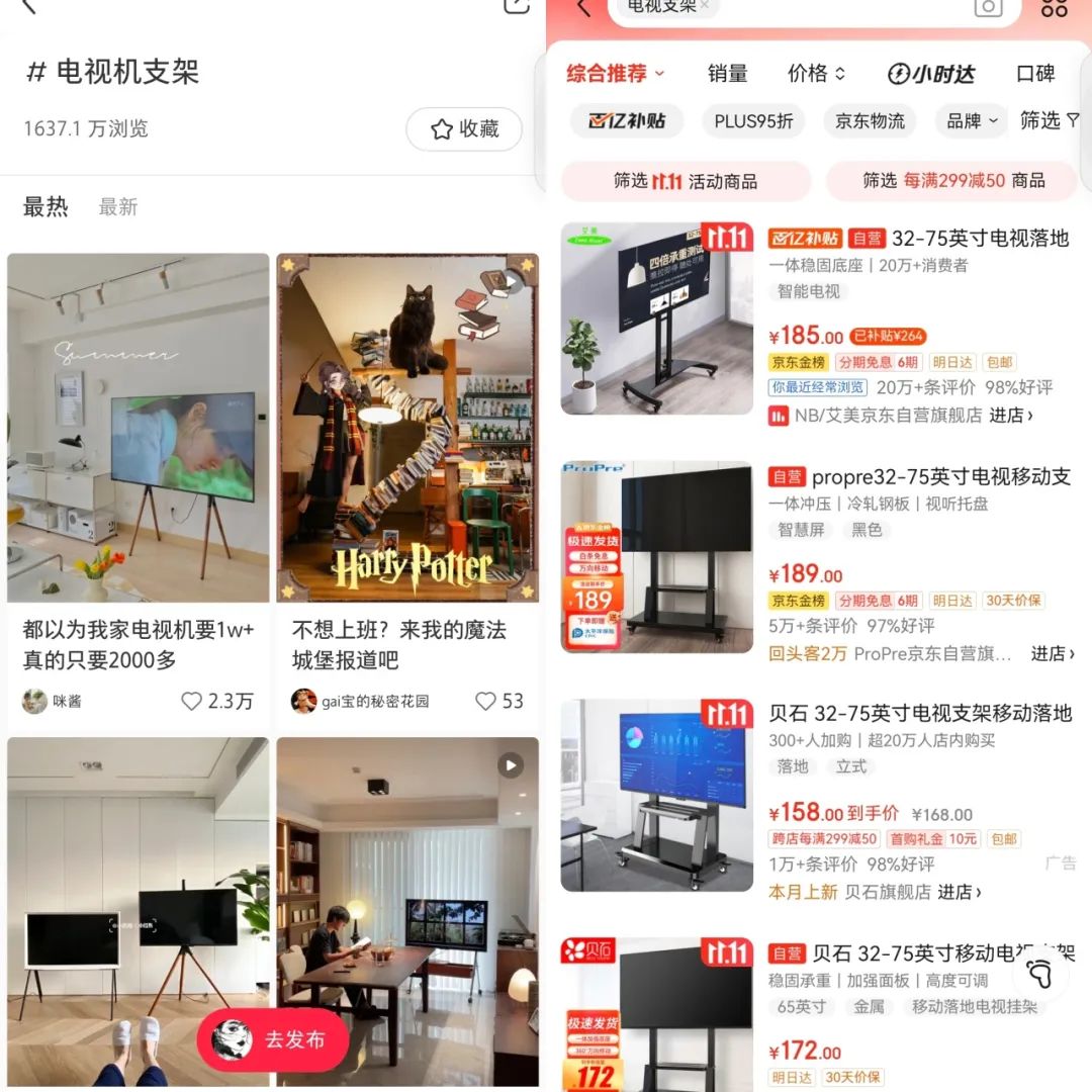 电视支架正在流行。京东上,电视落地支架的价格在一百元至六七百元不等,产品的评价数量大致在一万至二十万条,评论内容多为「安装简单」、「可以随意移动和调节升降」、「方便」。