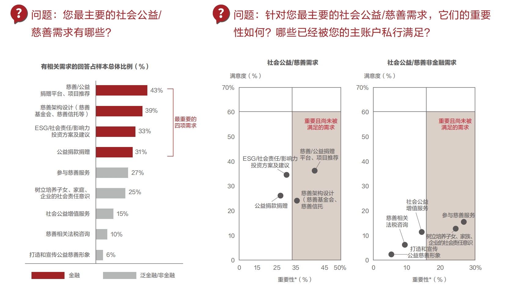 据招商银行《2023中国私人财富报告》显示,约四成受访者有对慈善/公益捐赠平台和项目推荐(43%)和慈善基金会、慈善信托等慈善架构设计(39%)的需求。