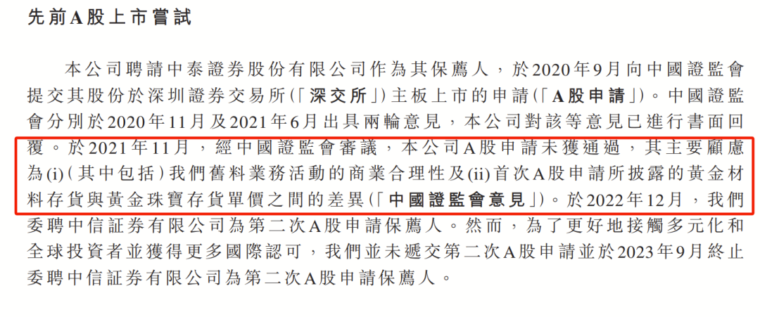 关于2021年,梦金园冲刺A股上市被否的原因,公司在港股《招股书》中表示,涉及旧料业务活动的商业合理性。