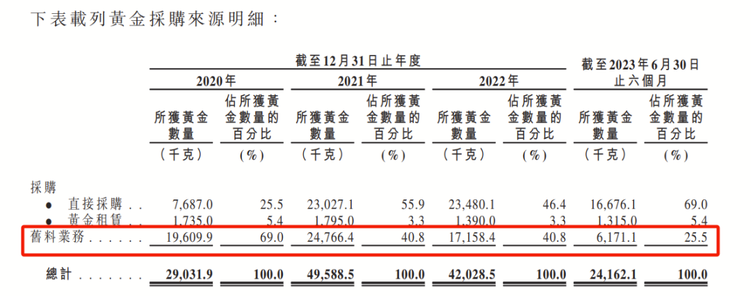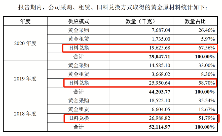 公司在A股《招股书》中称,由于公司每年第三季度大规模开展“一元换购”活动,加之新冠疫情和黄金价格上涨因素下,因此,黄金旧料比重有所提高。