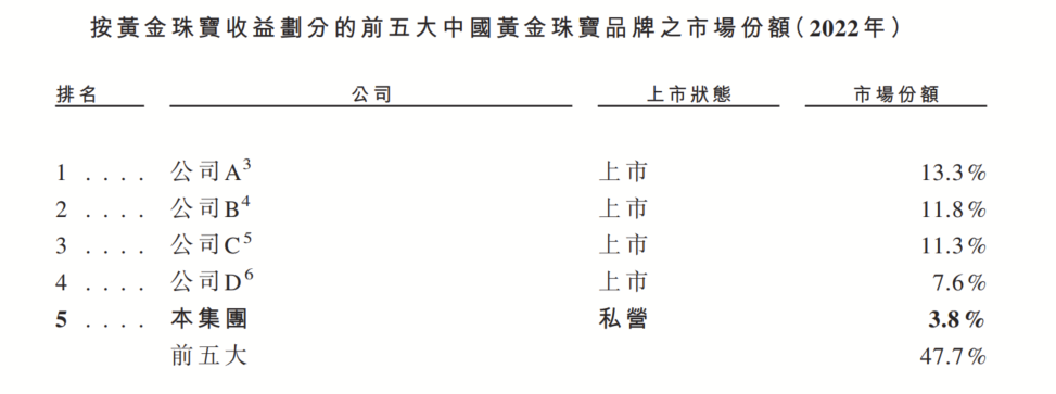 从市场格局来看,2022年,按黄金珠宝收益看,梦金园在中国黄金珠宝品牌市场中的份额为3.8%,名列第五名。排名前三的企业的市场份额则分别为13.3%、11.8%及11.3%,梦金园的个位数份额与前三名有所差距。