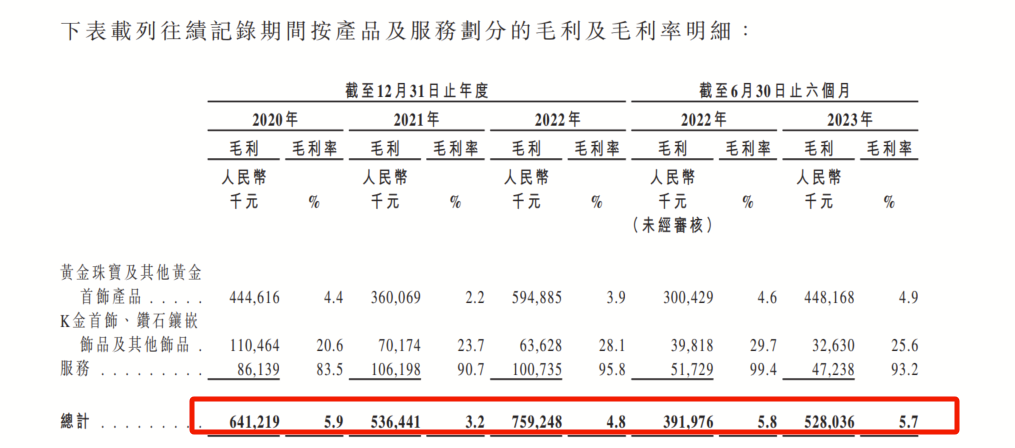 正在冲刺深交所主板的周六福,在2020年-2022年,毛利率分别为37.62%、34.92%、39.22%;港股上市的周大福则为28.36%、28.61%和22.58%,均远超梦金园的毛利率。