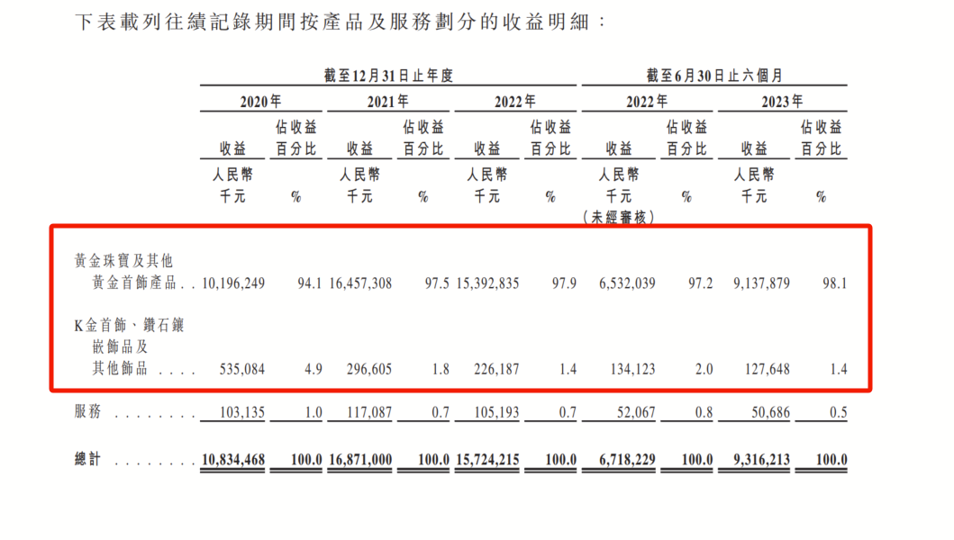 2020-2022年,黄金珠宝及黄金首饰的收入占公司总收入的94.1%、97.5%、97.9%。