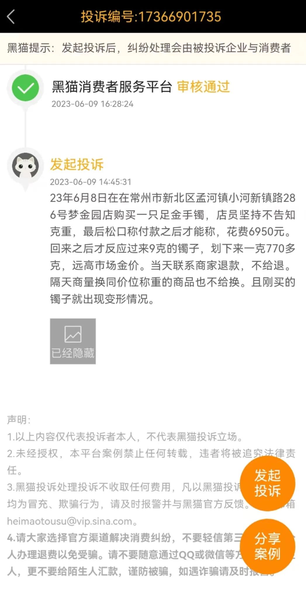 一路发展的过程中,梦金园的产品还曾因“一口价”被投诉。在黑猫投诉平台上,有消费者表示“在不知情的情况下售卖一口价黄金”“未公开克数,引导消费”等评价。其中,2023年6月8日的一条投诉显示,消费者在常州市新北区孟河镇小河新镇路286号梦金园店购买一只足金手镯,店员坚持不告知克重,最后松口称付款之后才能称,花费6950元。回来之后才反应过来9克的镯子,划下来一克770多元,远高市场金价。