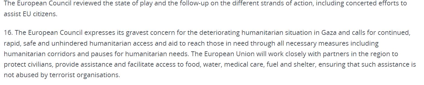欧盟官网公布的周四会议成果声明指出,欧盟27国再次谴责哈马斯对以色列的突袭,支持以色列在国际法和国际人道主义法范围内实施自卫权。