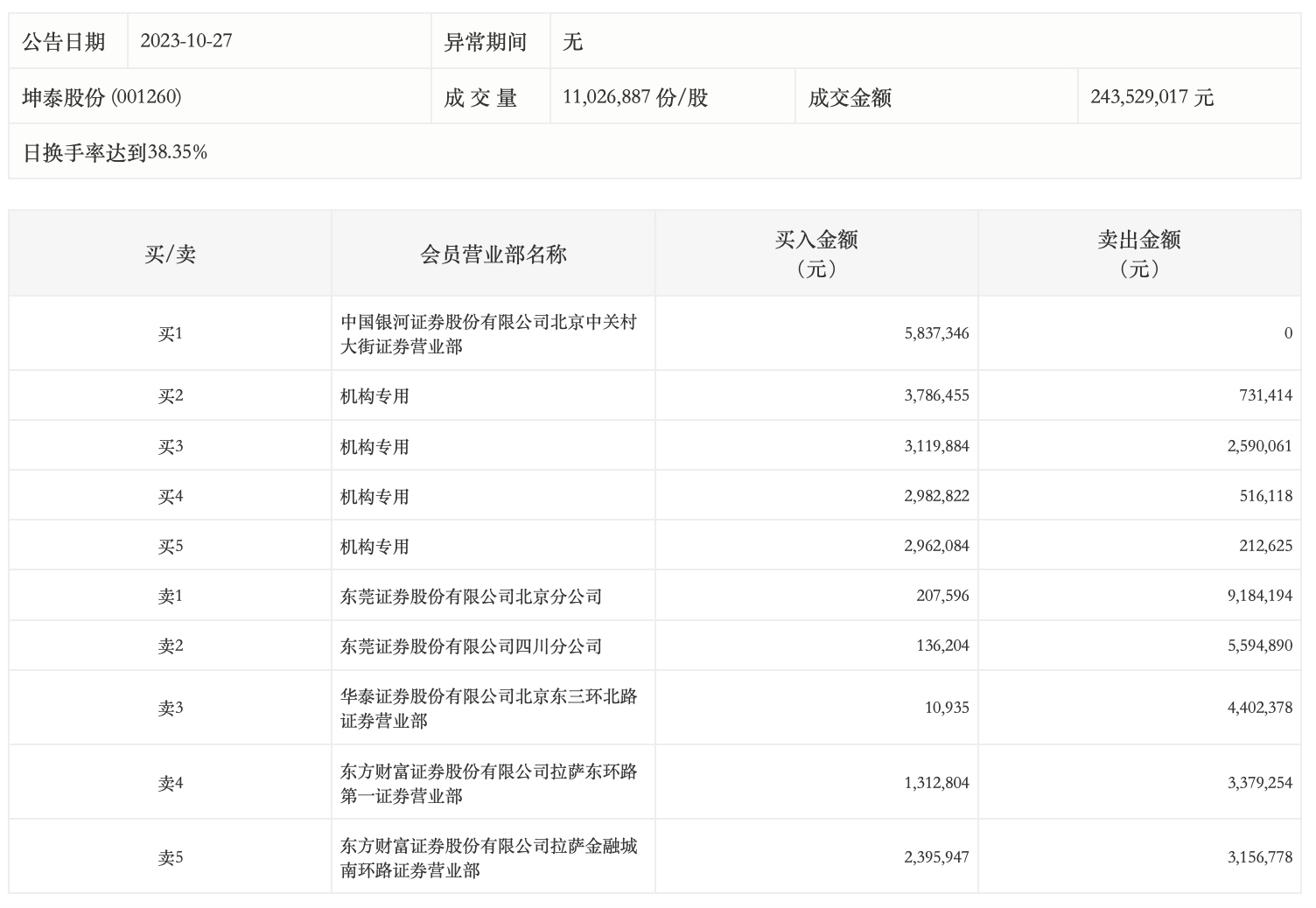 10月27日,坤泰股份今日跌4.42%,龙虎榜数据显示,上榜营业部席位全天成交5251.98万元,占当日总成交金额比例为21.57%。其中,买入金额为2275.21万元,卖出金额为2976.77万元,合计净卖出701.56万元。