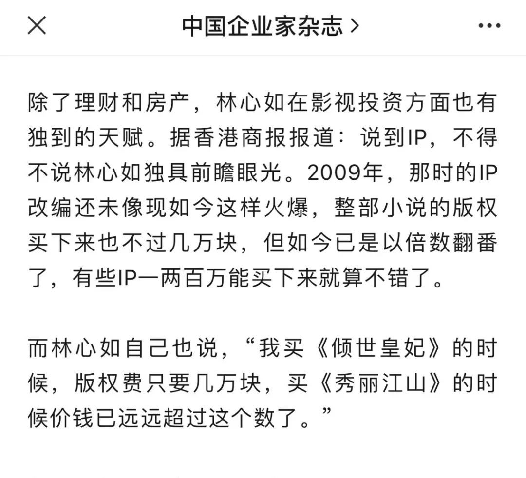 据媒体报道,2009年尝到了《美人心计》宫斗剧甜头的林心如,转身拿下了《倾世皇妃》的小说版权,彼时IP概念尚未盛行,在她的采访中透露版权费也只要几万块钱,但是后来这部投资4000万的电视剧版权费上亿、广告收入超百万,打响了她转型制片人的第一枪。后来她还购买了《秀丽江山》的小说IP并制作。