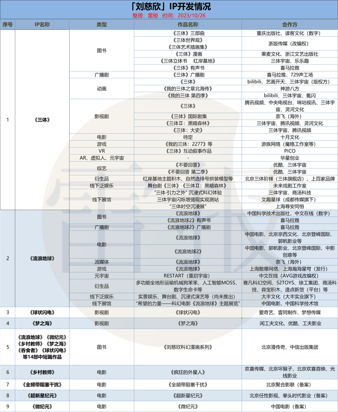 雷报整理和统计了刘慈欣IP目前的开发情况(人工统计存在误差):