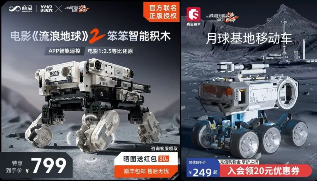 衍生品方面,《流浪地球2》在年初迎来过亿的众筹“爆单”,官方授权合作了包括赛凡科幻空间、52TOYS、徐工集团、商汤科技、森宝积木、阿里鱼造点新货平台等在内的多个品牌,打造了多功能全地形运输机械狗笨笨、人工智能MOSS、数字生命卡等多款产品。