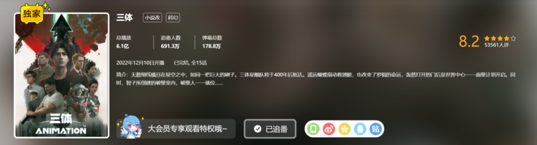 动画方面,《三体》动画由bilibili、艺画开天、三体宇宙出品,该作于2022年12月开播,目前已完结,截至发稿日共有6.1亿播放,691.3万人追番。