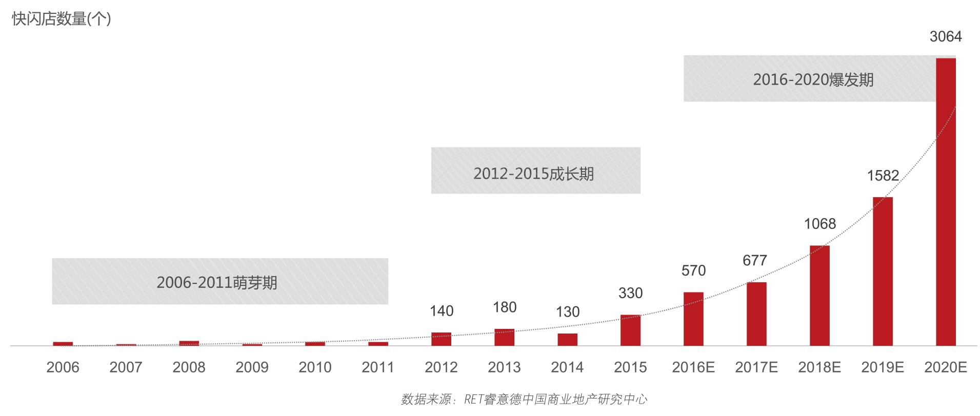 2012年前快闪店在中国处于萌芽阶段,2012年至2014年开始起步,从2015年开始进入一个快车道,平均每年复合增长率超过100%,预计2020年快闪店在中国将超过3000家。
