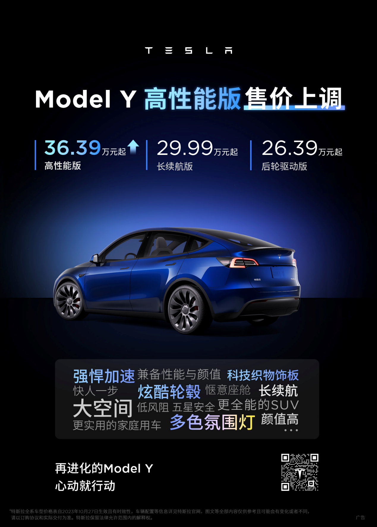 同时,全球销量冠军Model Y也迎来再进化。10月27日早上,特斯拉对再进化的Model Y售价进行调整——Model Y高性能版价格上调1.4万元,现在价格是36.39万元。就在同一天,特斯拉在北美也把Model Y长续航版的价格上调了500美元。