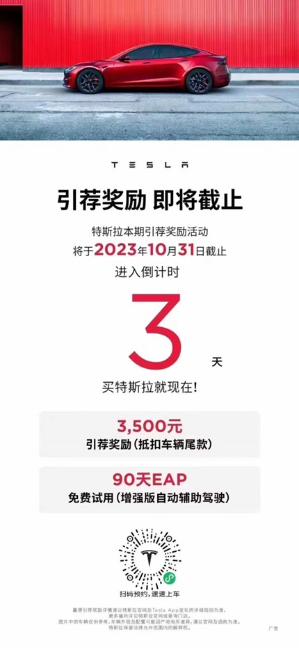 此外,特斯拉近期的购车福利即将截止。10月31日前,购车人通过好友引荐下订Model S/X/Y车型并在订单有效期内提车,还可获得3500元引荐奖励,以及90天增强版自动辅助驾驶功能免费试用福利;作为引荐人的老车主,成功邀请好友提走特斯拉,可获得7000积分奖励。