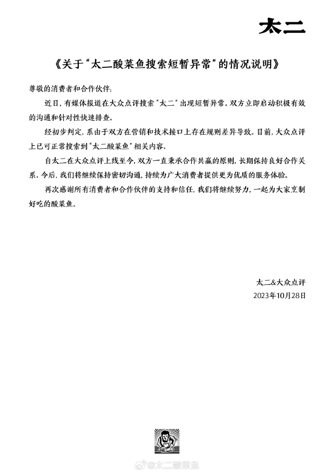 @太二酸菜鱼 10月28日发布声明,近日,有媒体报道在大众点评搜索“太二”出现短暂异常,双方立即启动积极有效的沟通和针对性快速排查。经初步判定,系由于双方在营销和技术接口上存在规则差异导致。目前,大众点评上已可正常搜索到“太二酸菜鱼”相关内容。