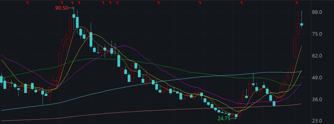 2021年4月起,赛力斯股价开始腾飞,短短一个月时间就从23.25元升至48.46元,随后创下66.67元的新高。此后的两年半时间,赛力斯股价呈现W型走势,最低跌至今年5月末的25.78元。今年二季度以来,赛力斯股价连连攀升。10月30日,报收80.2元,相比6月初的24.75元已翻了超过两倍。