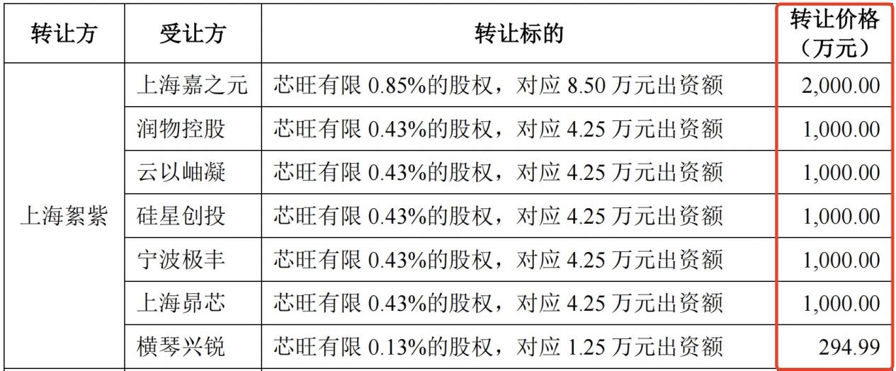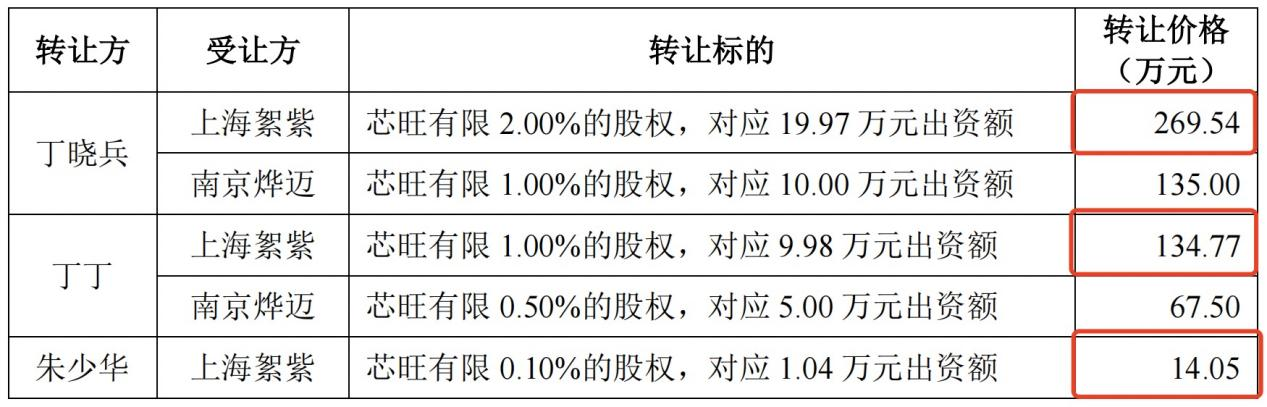 2021年3月,芯旺有限第一次股权转让时,上海絮紫企业管理中心(有限合伙)(下称:上海絮紫)曾从股东丁晓兵、丁丁、朱少华处受让3.10%的出资额,受让价格为13.50元/注册资本。