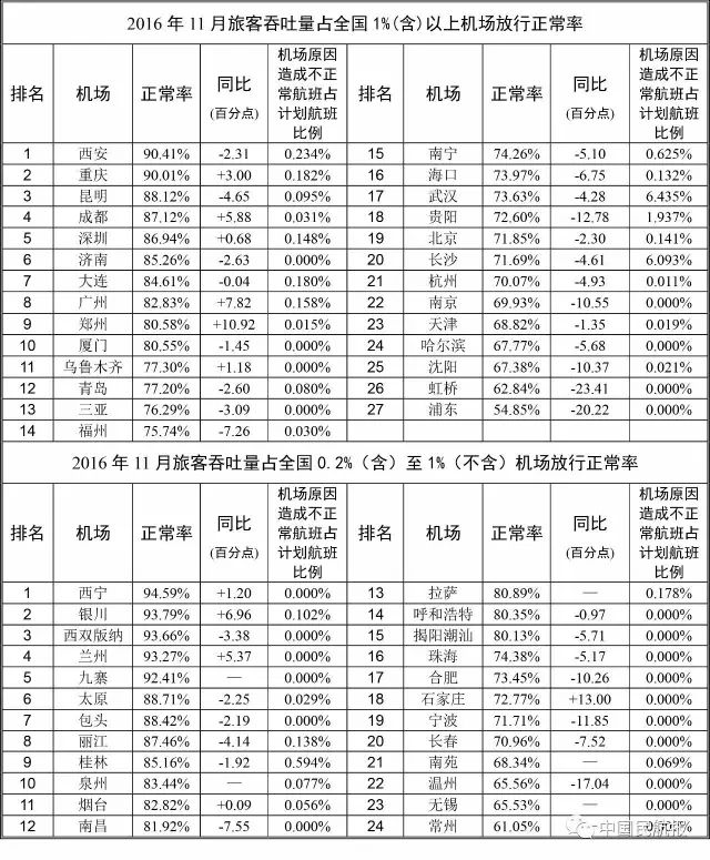 2016年11月国内主要机场平均放行正常率77.16%,同比降低3.68个百分点。国内主要机场中,西安机场以90.41%的放行正常率排名第一。