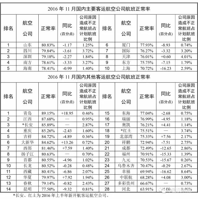 据民航报报道,2016年11月国内客运航空公司平均航班正常率为77.42%,同比降低3.93个百分点。国内主要客运航空公司中,山东航空以80.83%的航班正常率排名第一。