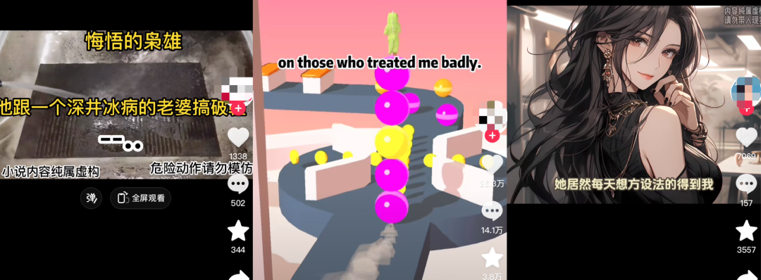 看得多了,晓月总结出了现在市面上常见的不同小说推文视频的配合素材,比如做蛋糕的是爽文,地铁跑酷是甜文,炒酸奶是重生文,削肥皂是末日文,做美甲的是真假千金文,清洗化妆品的是破镜重圆文。“整体风格上,甜不如虐,虐不如爽。”