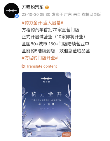 10月30日,比亚迪方程豹汽车通过官博宣布,方程豹汽车首批70家直营门店正式开启试营业(10家即将开业)。
