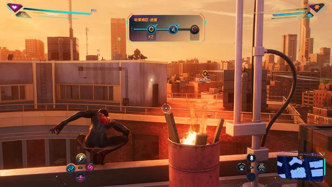 另一方面,2代地图不仅包括纽约曼哈顿岛,还扩大到有河流相隔的布鲁克林和皇后区,游戏为此提供了新的移动道具:蛛网翼,城市中则有与之配套的“风道”。当玩家操作蜘蛛侠进入气流通道,能展开双翼、模拟飞行、高速滑翔。