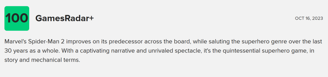 在M站上,有外媒如COGconnected打出满分100的同时,将游戏视为“如何创作续集的光辉案例”,而PlayStationUniverse则认为《漫威蜘蛛侠2》“重新定义了超级英雄类电子游戏,为玩家提供了终极的超级英雄幻想”。