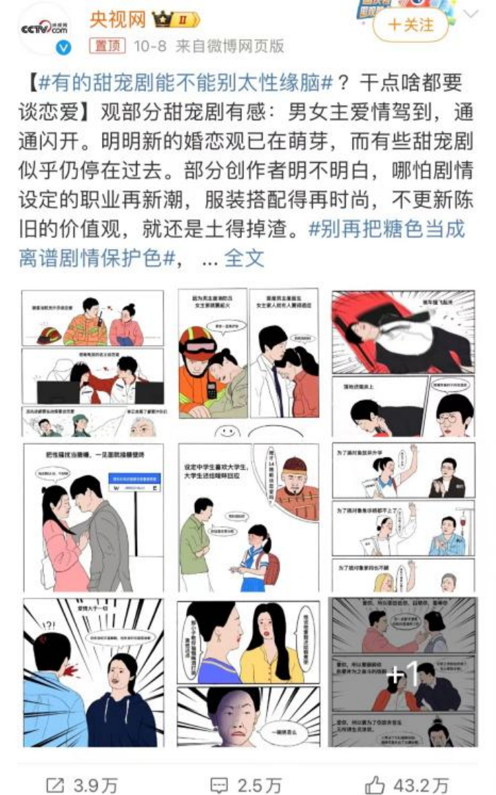 也难怪央视网官方微博发布的漫画会得到如此多网友的共鸣,部分甜宠剧秉持着“男女主爱情驾到,统统闪开”“干啥都得谈个恋爱”的原则,把劣质的工业糖精疯狂地往离谱的剧情上撒,最后不但没有得到理想的效果,还对观众的身心健康造成了严重的伤害。