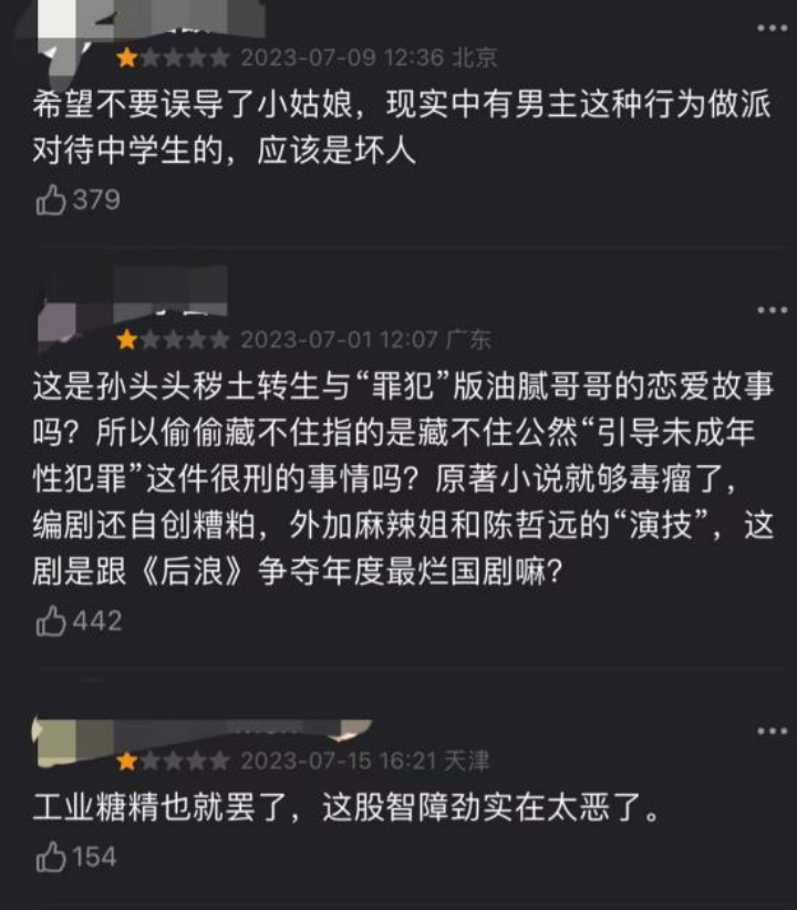 更要命的是,男主对未成年女主的回应也是暧昧的。一个心智还未完全成熟的未成年少女,和成年男性之间的关系可以是对等的吗?剧集完全没有提供除了女主之外的视角,用浪漫爱情将可能产生的问题统统掩盖上,也许剧集本意并不是提倡未成年人与成年人恋爱,但是表现出的问题不可不忽视,这种价值观也极有可能误导观众,造成不良影响。