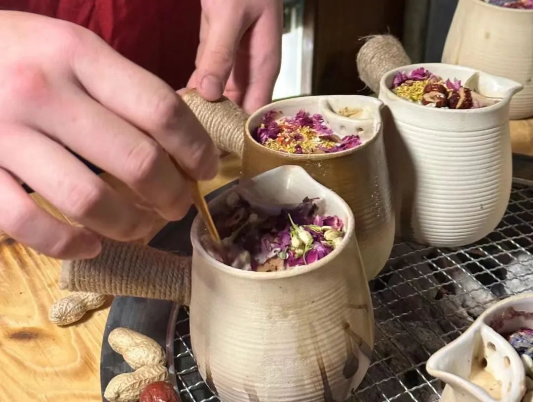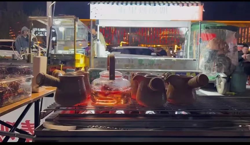 一个简单的小摊,一台炭火炉,几个陶罐,玫瑰、红枣、枸杞、茶叶、黄冰糖、牛奶等原料整齐摆放,“罐罐烤奶”最近的热度,让人想起去年的围炉煮茶。
