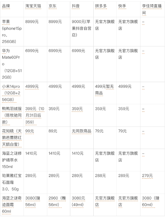 在服饰、美妆品类,随机统计里淘宝天猫价格反而没有优势。鸭鸭羽绒服以及花知晓某款腮红价格均比其他平台高出10-20元,同时间段其他家已经开始活动优惠价,天猫还没开始活动价;海蓝之谜同款面霜,赠送小样克数相同情况下,京东便宜80元。