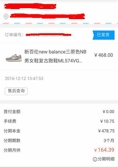 此外,蓝鲸TMT本周再次接到有关来分期售假的爆料。来自湖南的谭先生反映称,12月12日他在来分期购买了一双新百伦跑鞋,分期本金478.75元。