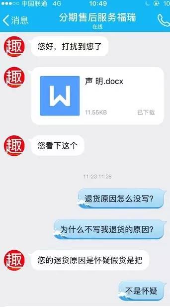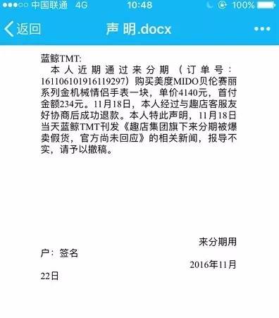 但令人感到不解甚至气愤的是,来分期的工作人员同时提出,希望谌先生在一份撤稿函中签字。在这份撤稿函中,来分期只字不提消费者退货的真实原因,却想借消费者之手混淆视听,进而要求蓝鲸TMT撤稿。(小编只想问,来分期的这个工作人员是在秀智商下限么?)