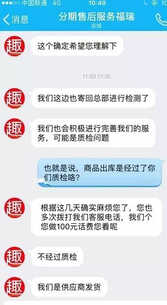 再回过来谈谈谌先生的遭遇,幸运的是,经过蓝鲸TMT的报道,来分期方面于11月23日主动联系了谌先生,不仅接受了他的退货申请,还承认了平台可能存在假货情况,并主动提出给谌先生报销100元话费。