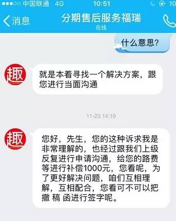 在谌先生拒绝签字并提出假一赔十的要求后,来分期的工作人员再一次主动联系他,表示公司领导很重视这件事,希望能和他面谈。同时表示将给予谌先生1000元路费补偿,并再次提出在撤稿函中签字的请求。