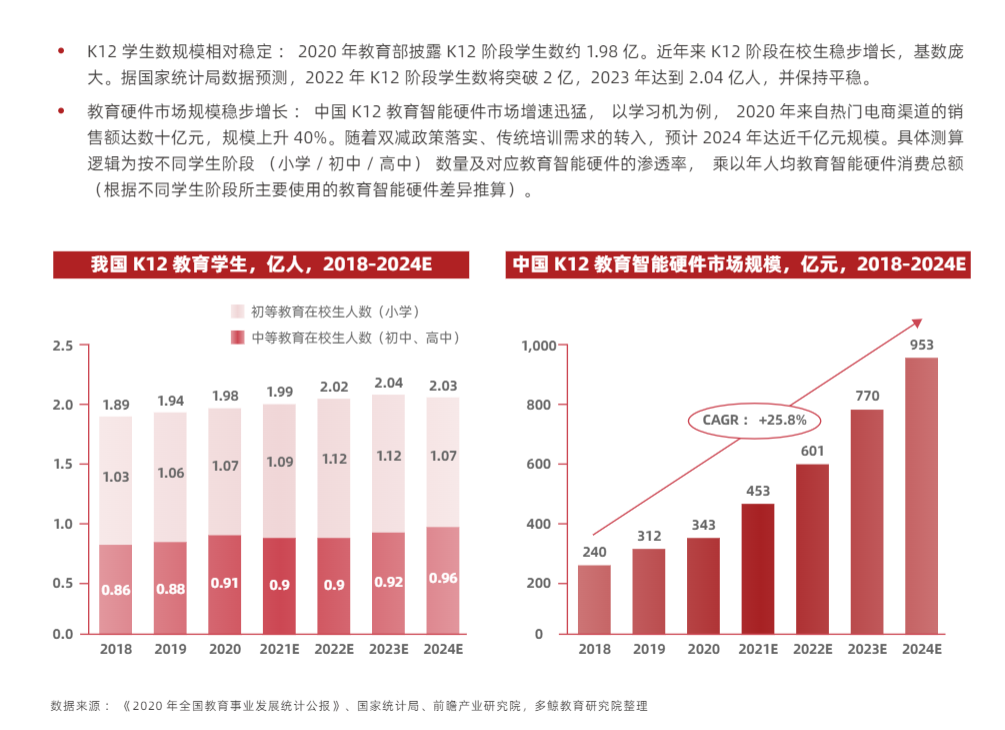 不过短短半年的时间,智能学习市场就随着大模型的应用下进入新一轮了“群雄逐鹿”。而众多企业争相推出搭载大模型的产品,也与巨大的市场规模密不可分。据多鲸资本发布的《2022年中国教育智能硬件行业报告》显示,学习机凭借着适应在家学习场景、渗透率高等特点成为教育智能硬件中的竞争重点;中国K12教育智能硬件赛道增长潜力巨大,预计2024年达近千亿规模。