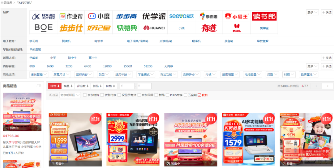 从电商平台的数据中,也能看出搭载AI的学习机有多“火热”。京东平台数据显示,今年“618”活动开启10分钟,学习机成交额就同比增长超100%;抖音电商榜单亦表明,截至6月18日24:00,位居学习机热卖榜单第一的学而思品牌销量达5.5万台,累计交易额2.5亿元。学习机在“双11”期间的热度依然不减,据10月23日京东发布的数据显示,京东“双11”开售10分钟内,学习机成交额同比增长超3倍。