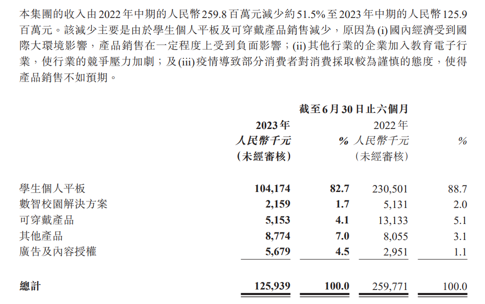 但同样也“加注”搭载大模型AI学习机的读书郎则没那么“欢喜”。据读书郎(2385.HK)半年报显示,公司2023年上半年实现收入1.26亿元,同比下降51.5%;其中,学生个人平板业务和可穿戴产品业务收入齐下降,学生个人平板业务收入同比下降54.8%至1.04亿元。