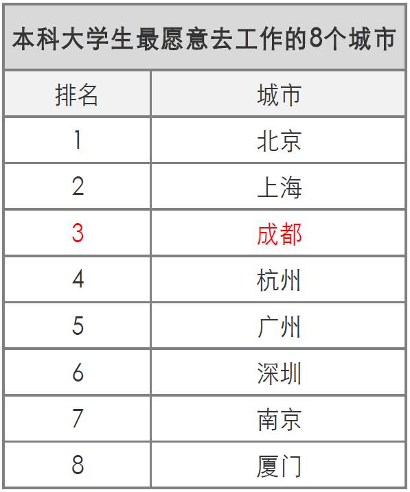根据北京大学社会调查研究中心和智联招聘联合发布的《2016中国年度最佳雇主年度总报告》,除了北京和上海之外,大学生最愿意去工作的城市却是成都,而非人才需求量最大的广州和深圳。