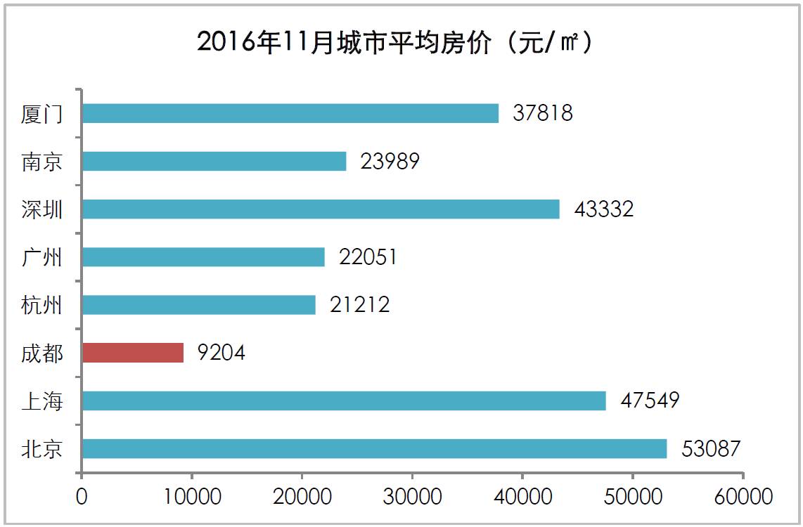 虽然成都房价在2016年也经历了逆天上涨的吊诡行情,特别是城南,一年内热点楼盘平均上涨了6000元/㎡,但放眼整个成都,整体均价相对其他城市还是较低的。