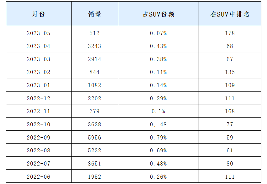 经销商的这种恶性竞争,不但会导致新入网经销商被淘汰出局,未入网的营销渠道不敢进入。而且营销渠道内斗下,并不能有效挖掘潜在消费者和竞争品牌的转化客户,最终也对广汽三菱销量构成反噬。自2022年6月至今年5月份,欧蓝德销量整体下滑严重,其在整个SUV市场中的排名更是跌到百名开外,市场份额更是不足1%。