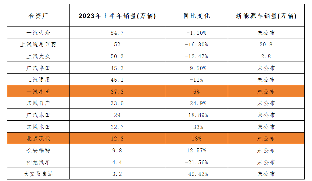 进入到2023年,这种情况仍在延续。以今年上半年为例,结合乘联会以及合资车官网数据来看,仅有一汽丰田和北京现代销量仍保持正向增长,其他11家合资品牌销量均呈现不同程度下滑。尤其是长安马自达、东风日产销量跌幅更是名列前茅。