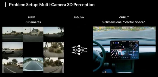 首先,特斯拉在2021年的Tech Day提出了使用Bird’s Eye View(BEV),即鸟瞰图,将车身四周摄像头所拍摄到的水平画面,通过Transformer提取共同特征进行三维构建,进行特征级融合,最终拿到一张反映周围环境的鸟瞰图。