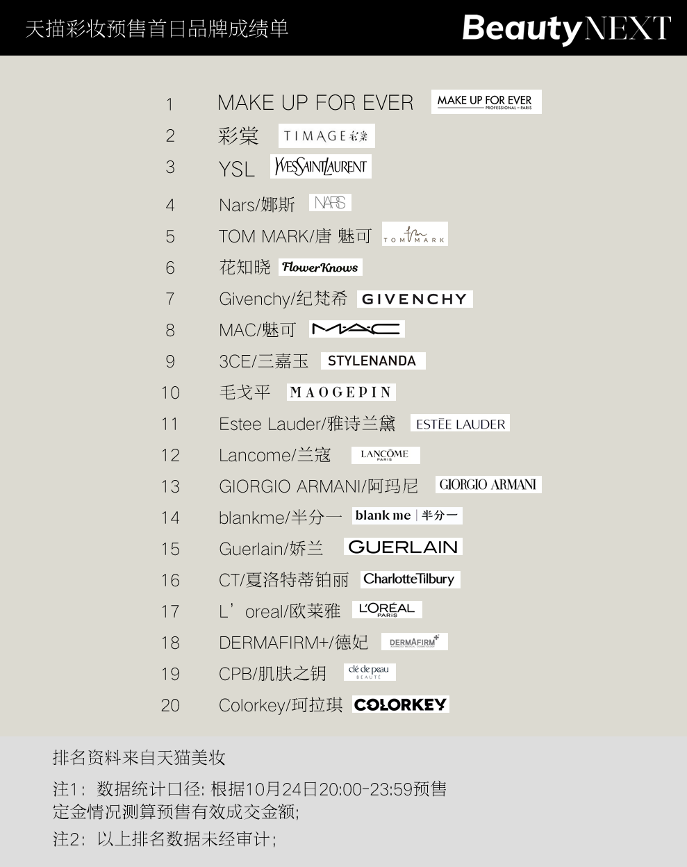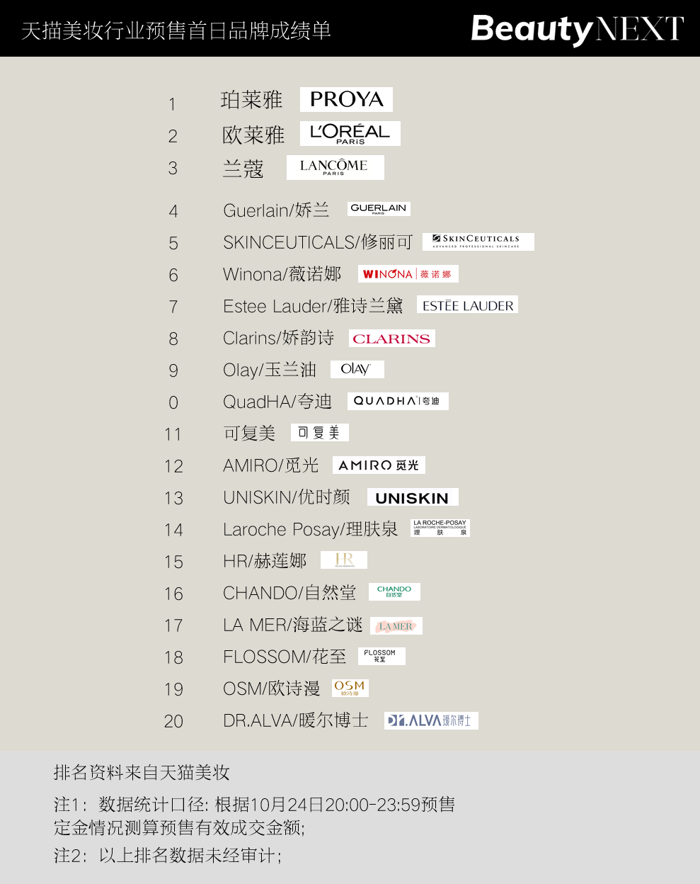 在天猫发布的美妆行业双11预售首日品牌榜单中,TOP20无一彩妆品牌上榜。全20名均为护肤或综合品类品牌。