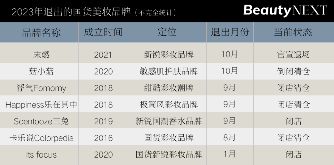 就在双十一开战前,10月16日,又一新锐彩妆品牌末燃也在社交平台宣告正式退场。据BeautyNEXT不完全统计,今年以来,包含肌安特、末燃在内共有8个国货美妆品牌已相继退场,其中彩妆品牌有5个,香氛品牌1个,护肤品牌2个。而这些倒在2023年的国货彩妆品牌,大部分是围绕“色彩类”产品发展的。